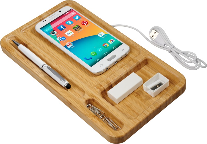 Technologische snufjes zijn altijd een winnaar bij cadeaus. Deze stijlvolle bureau-organizer combineert een hippe look met een draadloze oplader. Zo geef je je bureau een trendy uitstraling, en kan je meteen draadloos je telefoon opladen. Een win-win situatie.